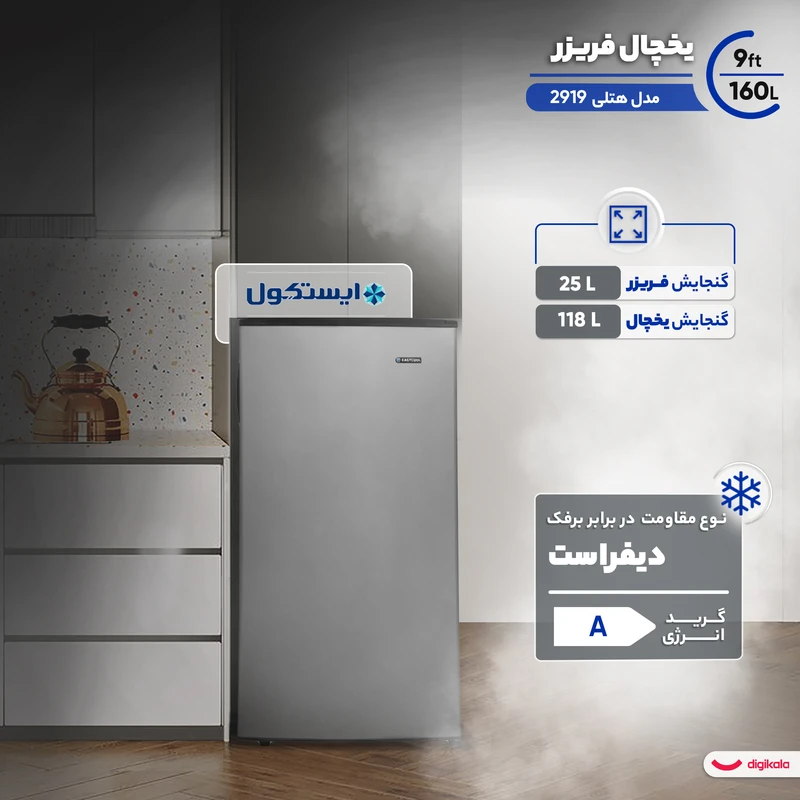 ایستکول TM 2919-150 با ظرفیت حدود 160 لیتر، بهگونهای طراحی شده که در کمترین فضا، بیشترین کارایی را ارائه دهد. بخش یخچال آن با طبقات شیشهای مقاوم و روشنایی مناسب، امکان چیدمان منظم غذا و نوشیدنی را فراهم میکند. وجود جای مخصوص بطری، کشوی میوه و سبزیجات، و طبقات درب باعث میشود استفاده از دستگاه بسیار راحت و کاربردی باشد.